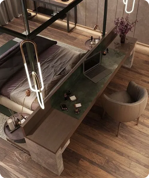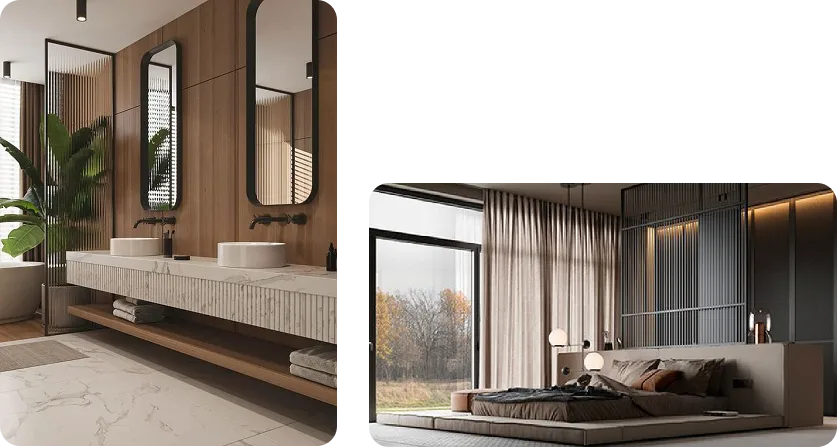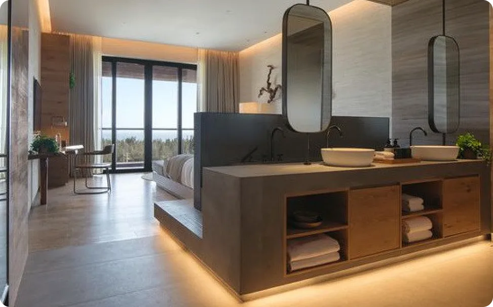 Mármol y madera en armonía, líneas minimalistas y amplios espejos.