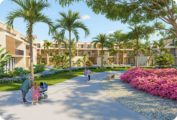 Este parque residencial dentro de Playa Nueva Romana incluye diseño sostenible, jardinería, lago artificial y anfiteatro al aire libre.